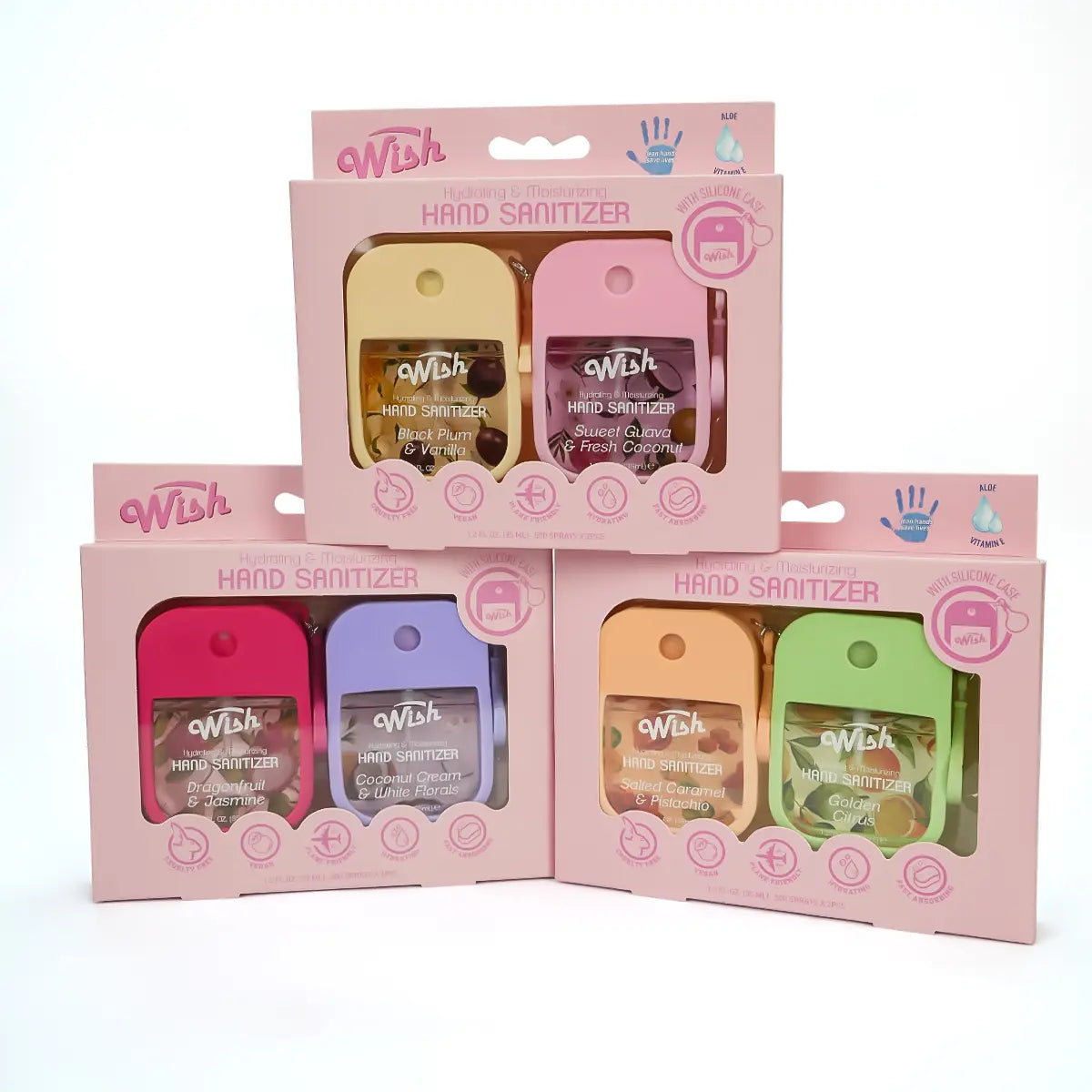 Hand Sanitizer Spray Gift Box, 2 Travel-Size Bottles (1.2 oz Each) w/ Silicone Case & Keychain, Black Plum & Vanilla | Sweet Guava & Fresh Coconut | Salted Caramel & Pistachio | Golden Citrus | Dagontruit & Jasmine | Coconut Cream & White Florals