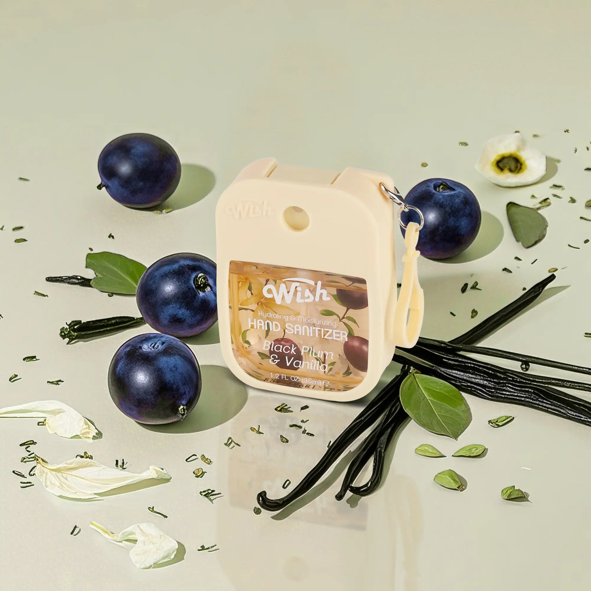 Wish Hand Sanitizer is your daily embrace—think ripe plum and velvet vanilla vibes in a pocket-sized powerhouse that cleanses + cradles. It's giving bakery-fresh energy, cozy sweater mood, and that just-lotioned softness.