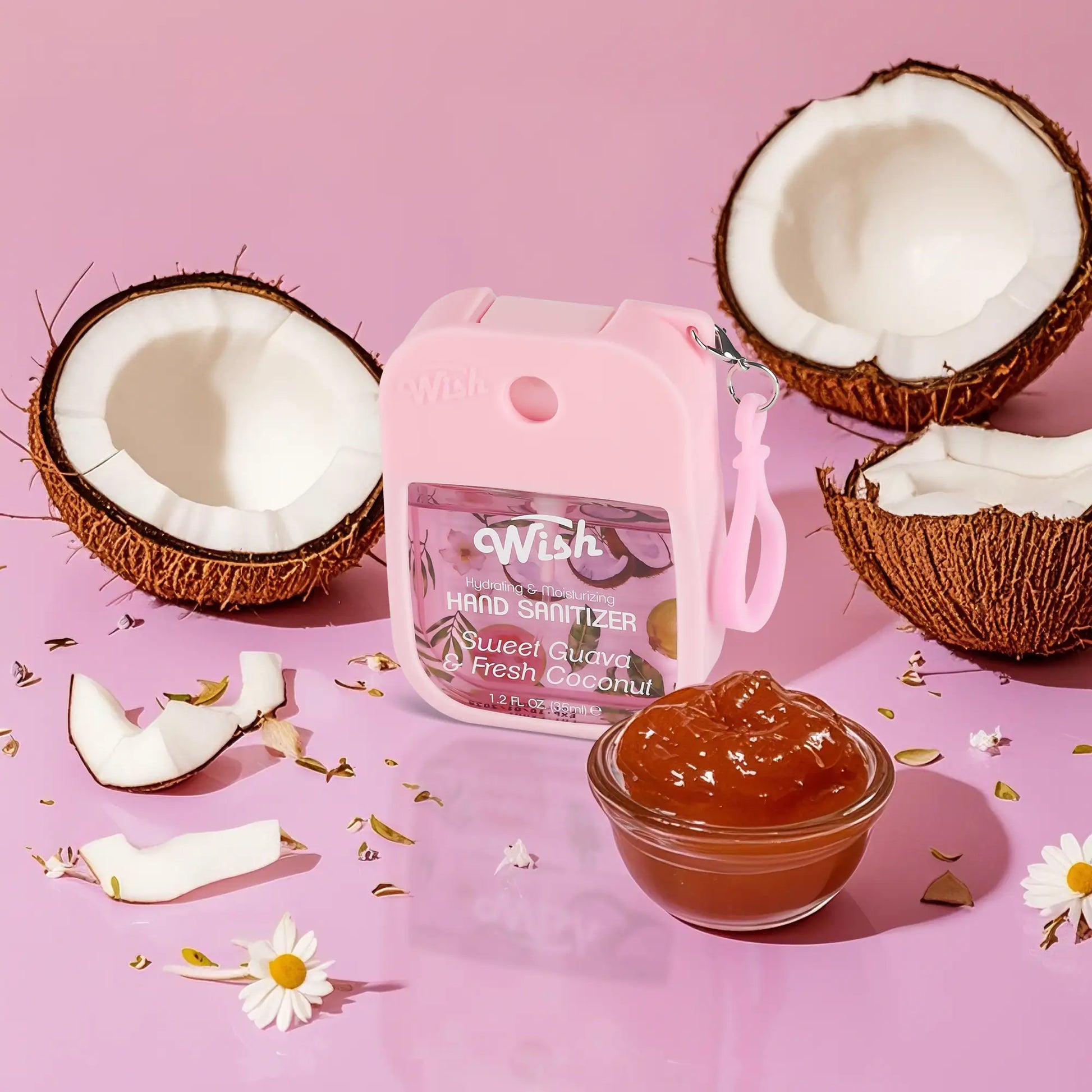 Wish Sweet Guava & Fresh Coconut Hand Sanitizer is your daily escape—think juicy guava and creamy coconut vibes, bottled up and ready to glow. It's giving beach-to-brunch energy, piña colada mood, and that just-spritzed freshness.