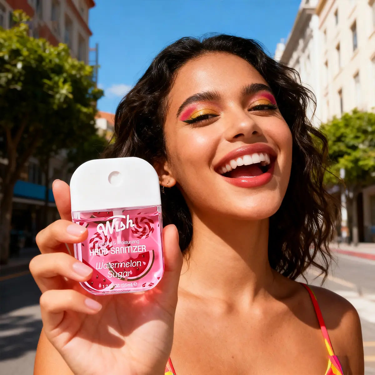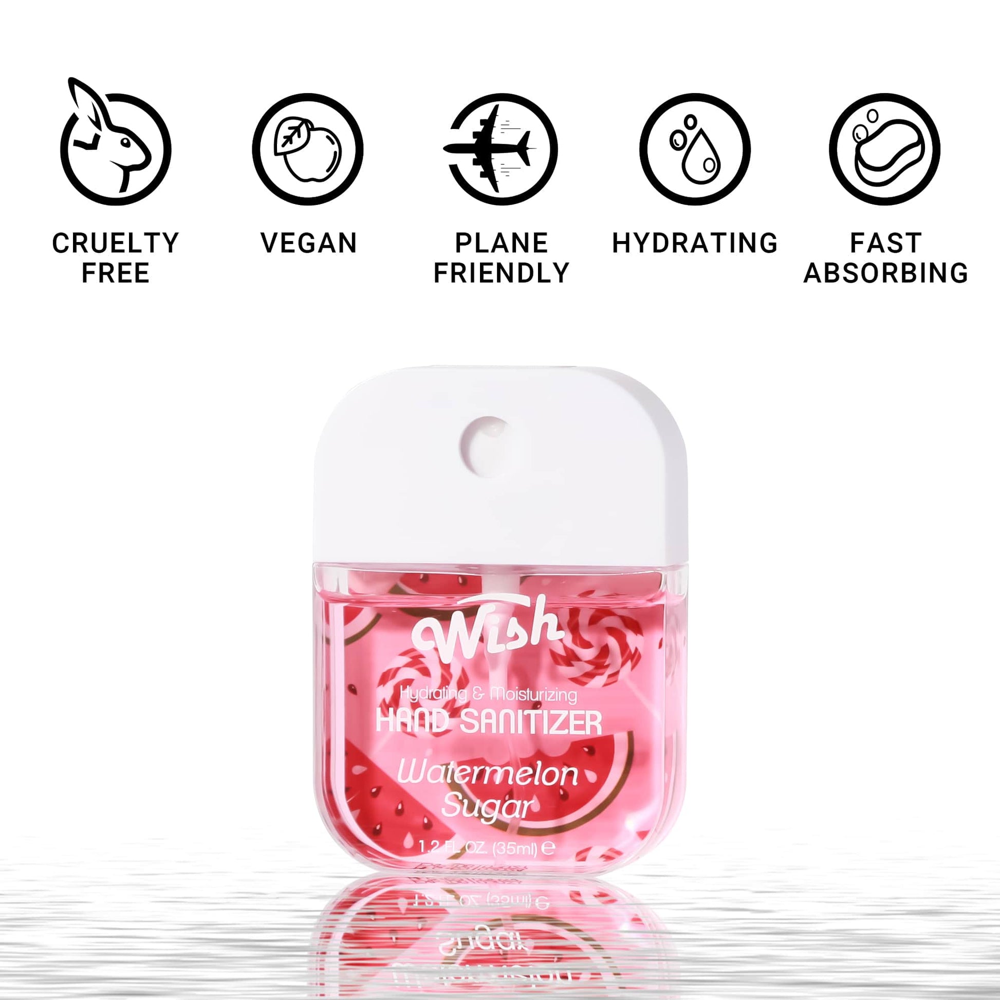 Stay fresh and protected wherever you go with Wish Watermelon Sugar Hand Sanitizer. Infused with a sweet and fruity watermelon sugar fragrance, this compact 1.2 FL OZ spray combines effective cleansing with intense hydration. Its moisturizing and fast-absorbing formula helps prevent dryness, keeping your hands soft and smooth after every use. Designed for convenience, the portable spray bottle slips easily into your purse, pocket, or travel bag—perfect for on-the-go protection. Plus, it’s cruelty-free, vegan, and planet friendly.